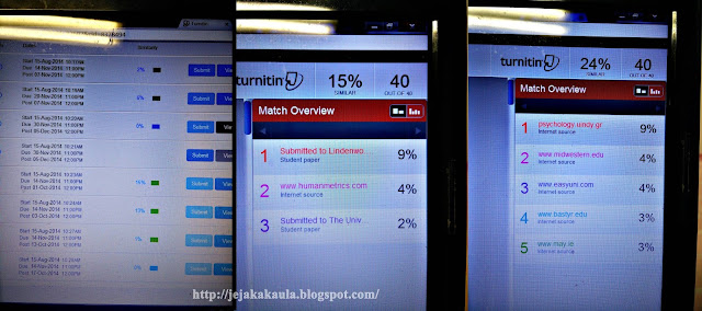 Kat sana, berapa peratus ko plagiat semua tahu. Siap bagi link website yang ko curi ayat lagi tau. Aku cuma plagiat masa first assignment aku je, gila 80% something copy paste, malu weyh. Mana nak letak muka. Nasib baik lah profesor tu tahu aku nie pelajar luar. So dia pon tegur supaya paraphrase or rephrase balik ayat untuk assignment seterusnya, tak pon letak citation. Nasib baik lah dapat markah penuh. Fuhh. Since then kan, aku tak plagiat lagi. Tu jelah satu-satunya assignment yang aku banyak copy paste. Lepas dari tu semua assignment aku buat sendiri.